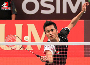 Pemain Indonesia, Tontowi Ahmad berusaha mengembalikan kok ke arah pasangan Thailand, Sudket Prapakamol/Saralee Thoungthongkam.