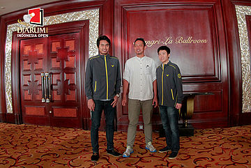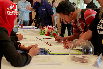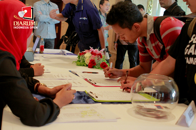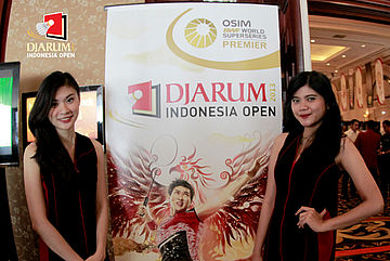 Banner Djarum Indonesia Open Super Series Premier 2013 menghiasi tempat berlangsungnya press conference.