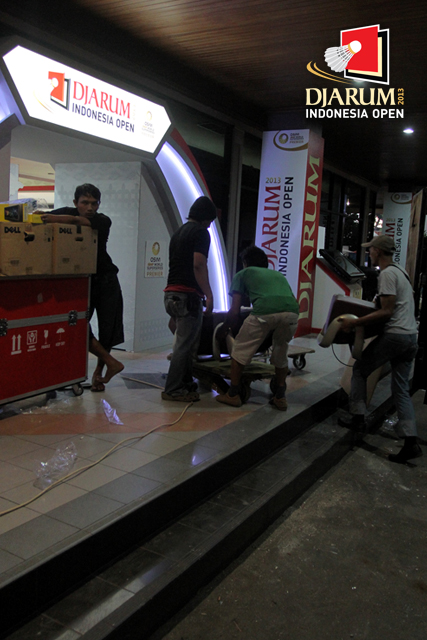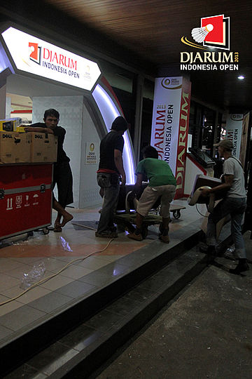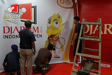 Giant Banner Djarum Indonesia Open Super Series Premier 2013 terpampang di samping Nations Pride Arena, Istora Senayan, Jakarta.