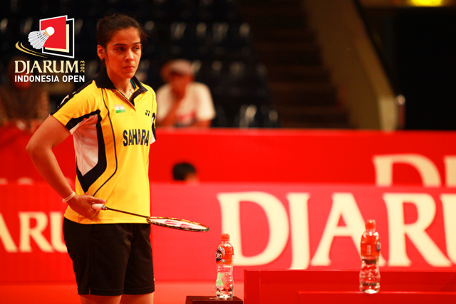 Saina Nehwal (India) saat memperhatikan rekan-rekannya berlatih di Nations Pride Arena, Istora Senayan.