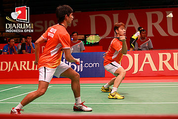 Andrei Adistia/Markus Fernaldi Gideon (Indonesia) menyambut pengembalian dari pasangan Korea Selatan, Kang Ji Wook/Sang Joon Lee.