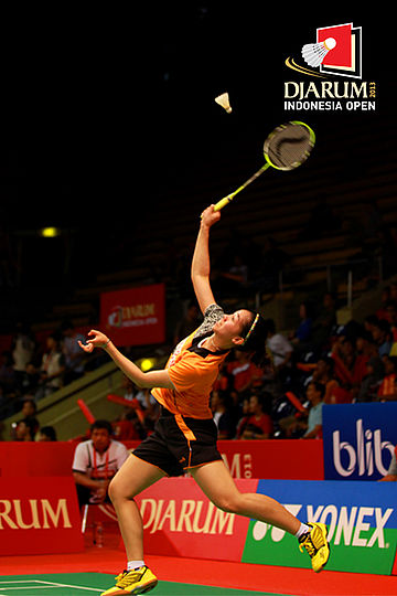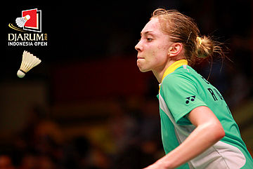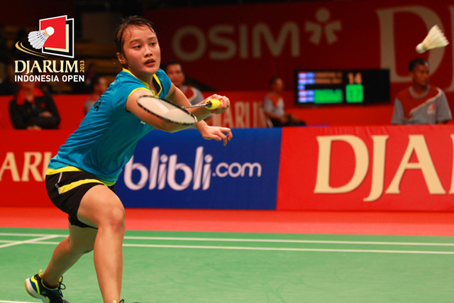 Febby Angguni (Indonesia) mengembalikan shuttlecock ke arah Anna Astrakhantseva (Rusia).