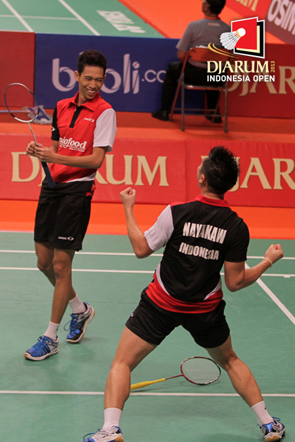 Ekspresi Wahyu Nayaka/Ade Yusuf (Indonesia) usai memenangkan pertandingan melawan Adam Cwalina/Przemyslaw Wacha (Polandia).