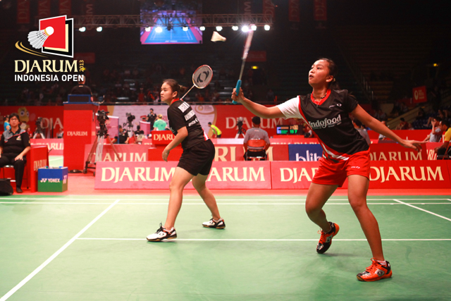 Melati Daeva/Rosyita Eka (Indonesia) mengembalikan shuttlecock ke arah pasangan Ravenska Cintya/Chintia Rhizta (Indonesia).