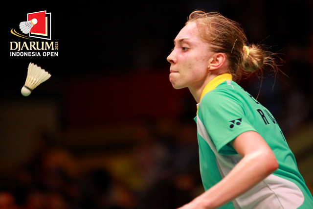 Hana Ramadhini (Indonesia) bersiap mengembalikan shuttlecock ke arah Natalia Perminova (Rusia).