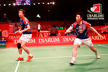 Wang Zhengming (China) bersiap mengembalikan shuttlecock ke arah Lee Chong Wei (Malaysia).