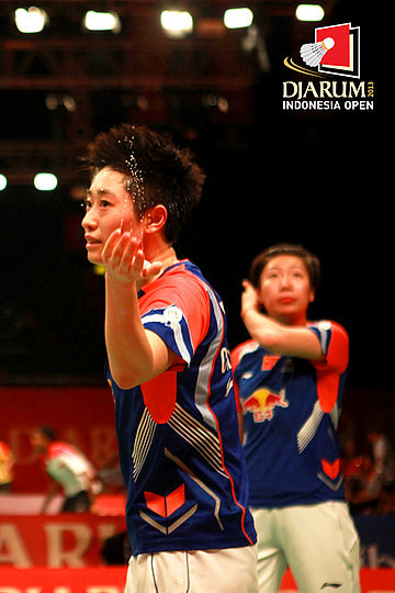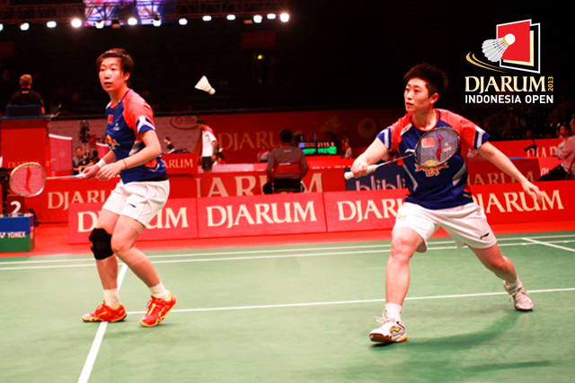 Pasangan ganda putri peringkat satu dunia, Wang Xiao Li/Yu Yang (China) bersiap mengembalikan shuttlecock ke arah pasangan asal Jepang, Naoko Fukuman/Kurumi Yonao.