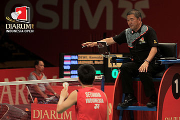 Hendra Setiawan (Indonesia) meminta pergantian shuttlecock.