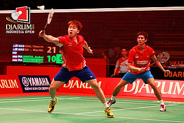 Andrei Adistia/Markus Fernaldi Gideon (Indonesia) menyambar pengembalian tanggung dari pasangan ganda putra Malaysia, Thien How Hoon/Wee Kiong Tan.