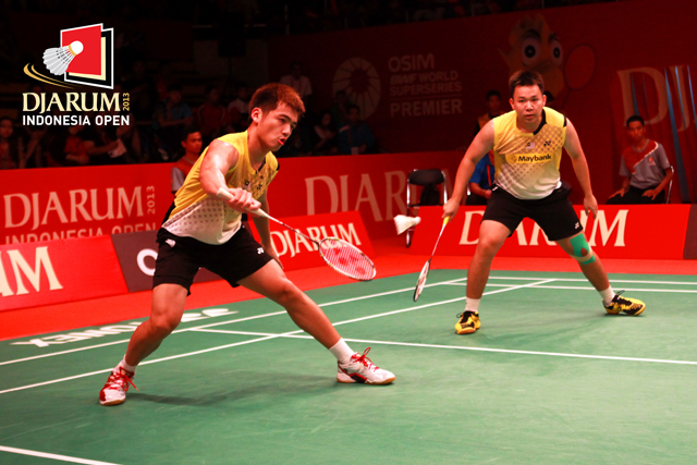 Pasangan ganda putra Malaysia, Thien How Hoon/Wee Kiong Tan menghadang serangan yang dilancarkan Andrei Adistia/Markus Fernaldi Gideon (Indonesia).