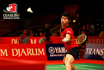 Sho Sasaki (Jepang) bersiap mengembalikan shuttlecock ke arah Bonsak Ponsana (Thailand).