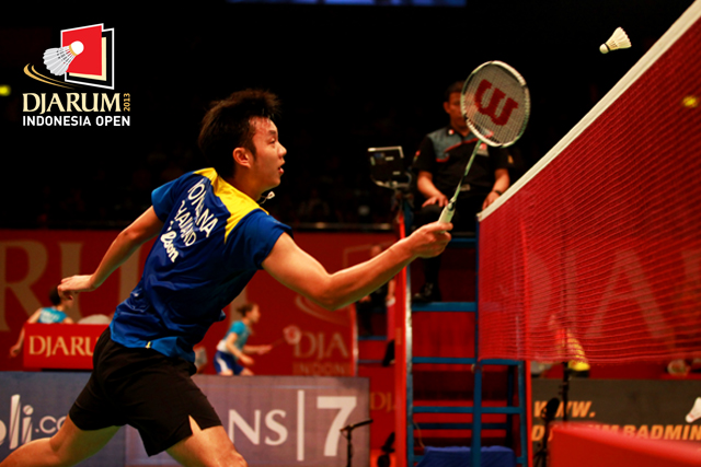 Bonsak Ponsana (Thailand) bersiap menyambar pengembalian tanggung dari Sho Sasaki (Jepang).
