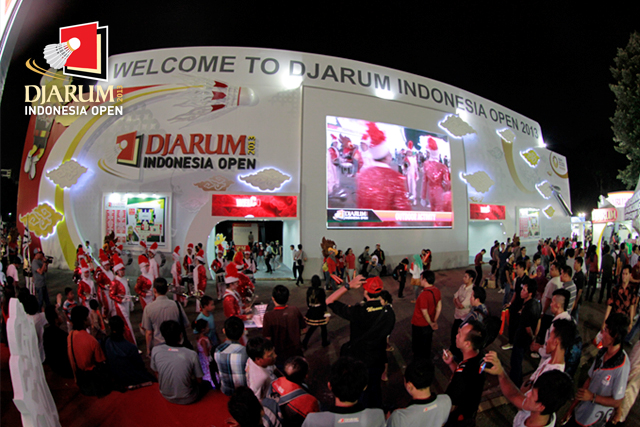 Penampilan salah satu vokalis band saat menghibur parapengunjung Djarum Indonesia Open Super Series 2013.