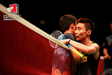 Lee Chong Wei (Malaysia) saat berpelukan dengan Dionysius Hayom Rumbaka (Indonesia) usai bertanding.