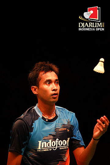 Dionysius Hayom Rumbaka (Indonesia) melempar shuttlecock yang baru saja diganti.