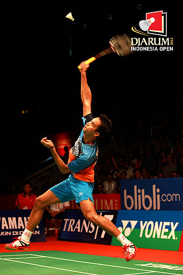 Dionysius Hayom Rumbaka (Indonesia) melepaskan smash ke arah Lee Chong Wei (Malaysia).