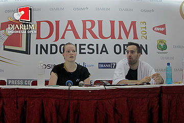 Joachim Fischer/Christinna Pedersen (Denmark) saat melakukan press conference.