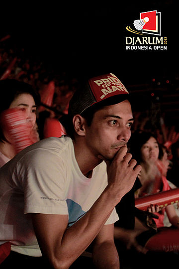 Fauzi Baadilah terlihat fokus menyaksikan pertandingan semifinal Djarum Indonesia Open Super Series Premier 2013 di Istora Senyan.