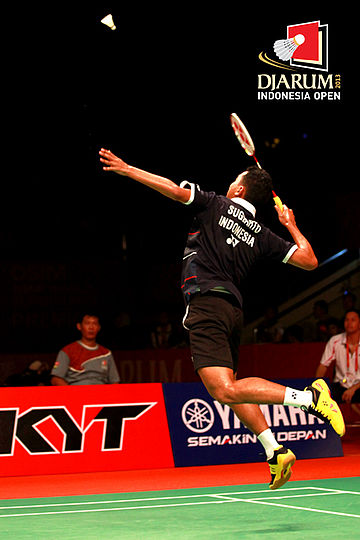 Tommy Sugiarto (Indonesia) mengembalikan shuttlecock ke arah Marc Zwiebler (Jerman).