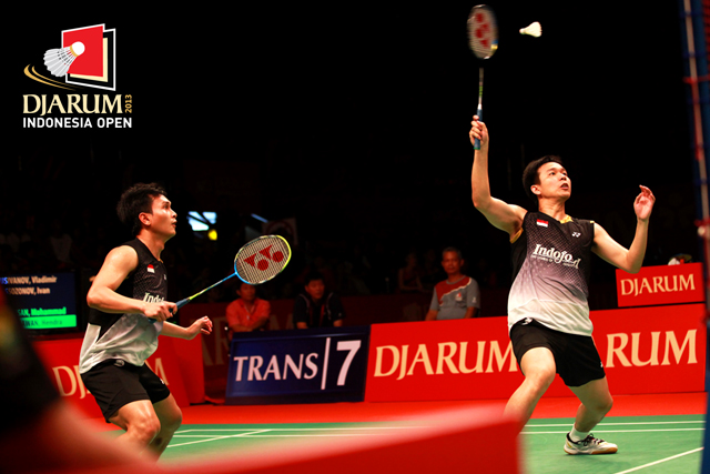 Mohammad Ahsan/Hendra Setiawan (Indonesia) mengembalikan shuttlecock ke arah pasangan asal Rusia, Vladimir Ivanov/Ivan Sozonov.