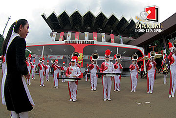 Penampilan marching band di depan Celebrity Bazaar cukup menarik perhatian sejumlah pengunjung yang hadir di Istora Senayan.