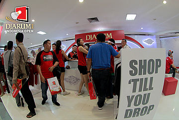 Steny Agustaf (kiri) saat menyapa para suporter Indonesia yang memadati tribun di Istora Senayan.
