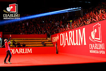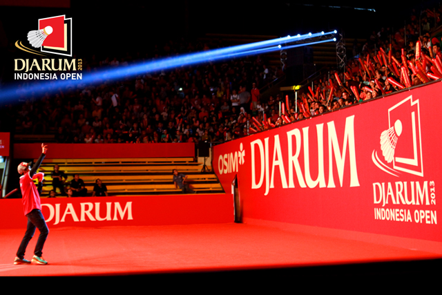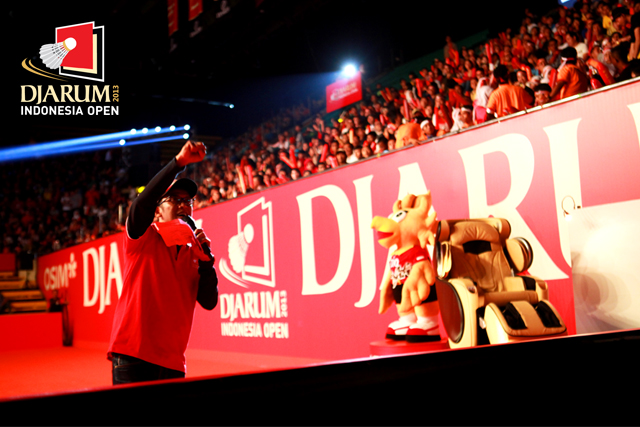 Steny Agustaf saat menyapa para suporter Indonesia yang memadati tribun di Istora Senayan.