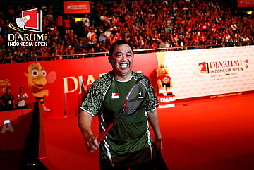 Eddy Hartono saat memasuki lapangan pertandingan untuk mengikuti pertandingan "Badmin-Punk" bersama Haryanto Arbi, Sigit Budiarto dan Trikus Harjanto.
