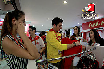 Marissa Nasution (kiri) dan Mike Lewis saat memilih marchandise di booth Djarum.