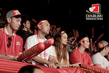 Salah satu suporter fanatik bulutangkis Indonesia terlihat siap dengan atributnya untuk mendukung para atlet tuan rumah.