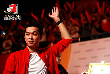 Taufik Hidayat memberikan apresiasi kepada ribuan pengunjung yang memadati Istora Senayan usai acara perpisahannya sebagai atlet bulutangkis profesional.