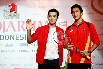 Taufik Hidayat (kiri) memberikan kenang-kenangan sebuah raket kepada salah satu atlet penerus Indonesia, Jonathan Christie.
