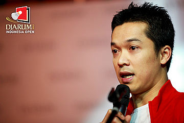 Taufik Hidayat saat memberikan sambutan perpisahannya sebagai atlet bulutangkis profesional di Istora Senayan.