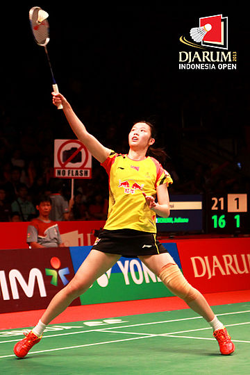 Li Xuerui (China) mengembalikan shuttlecock ke arah Juliane Schenk (Jerman).