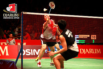 Ko Sung Hyun/Lee Yong Dae (Korea Selatan) menyambar pengembalian tanggung dari Mohammad Ahsan/Hendra Setiawan (Indonesia).
