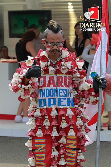 Salah satu pengunjung Djarum Indonesia Open Super Series Premier 2013 beratribut nyentrik untuk mendukung Mohammad Ahsan/Hendra Setiawan di final ganda putra.