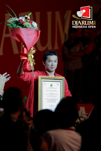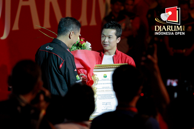 Taufik Hidayat mendapatkan penghargaan dari publik bulutangkis Indonesia dalam acara perpisahannya sebagai atlet bulutangkis profesional di Istora Senayan.