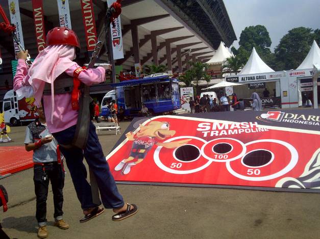 One of the most anticipated is “Smash Trampolin Games”. The game is interesting to enjoy. The combination of adrenaline and the speed of SMASH pointed three spots containing points. One of the games which you can't miss to play is able to be played by everyone less than 80kg weigth. A trampolin and its saftey device have been provided for the guests. If you're interested, after the safety belt is put on, you have to jump while holding a racket and smash the shuttlecock being thrown by the crews. There are three points available, 50, 100 and 150 as your targets. You will only get three chances to score. If you can score 200 points, you'll get two t-shirts, 150 points will get you one t-shirt and 50-100 iw worth a pin. Isn't that pretty cool? So, what are you waiting for? Visit the Nation’s Pride Arena and spark the DIOSSP 2013! Pride of The Nation