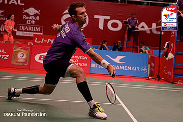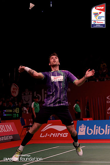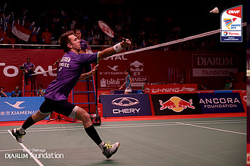 Jan O Jorgensen (DEN) mengembalikan shuttlecock ke arah lawan