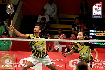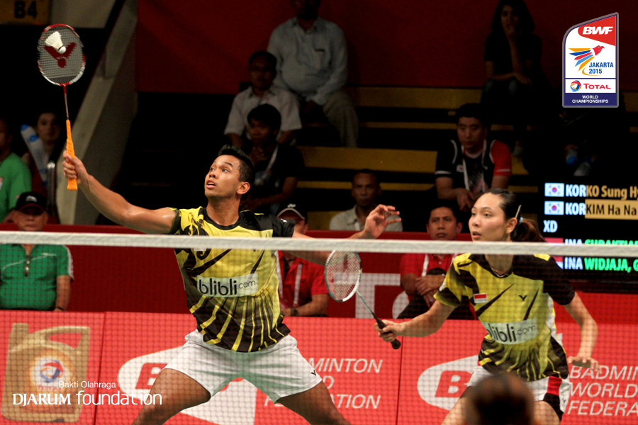 Tontowi Ahmad/Liliyana Natsir (INA) menahan serangan lawan