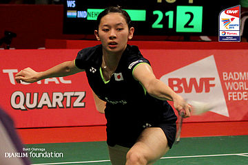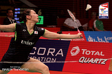 Sayaka Takahashi (JPN) mengembalikan shuttlecock ke arah lawan