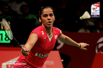 Saina Nehwal (IND) berusaha menggapai shuttlecock