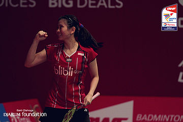 Kegembiraan Debby Susanto (INA) saat memenangkan pertandingan
