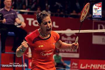 Ekspresi Carolina Marin (ESP) saat memenangkan pertandingan