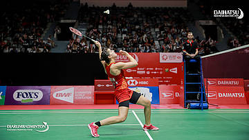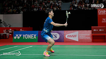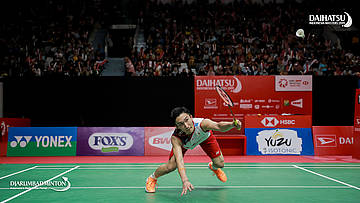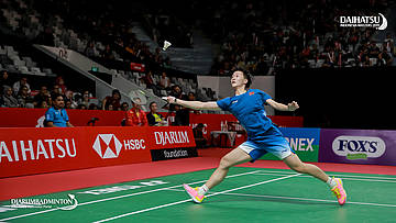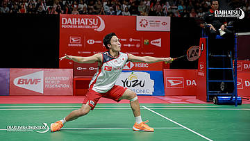 Kento MOMOTA (Japan) berusaha mengembalikan serangan