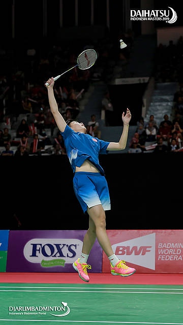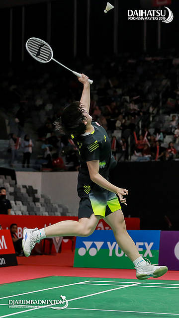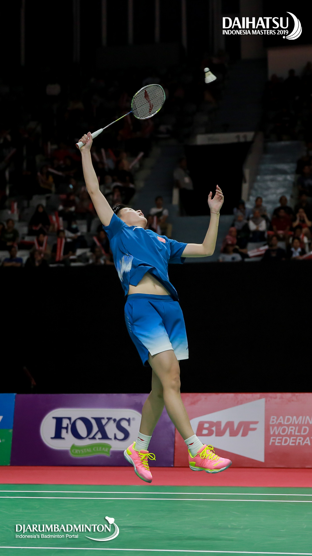 CHEN Yufei (Tiongkok) berusaha menggapai pengembalian