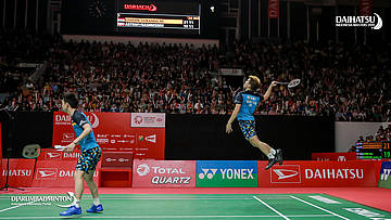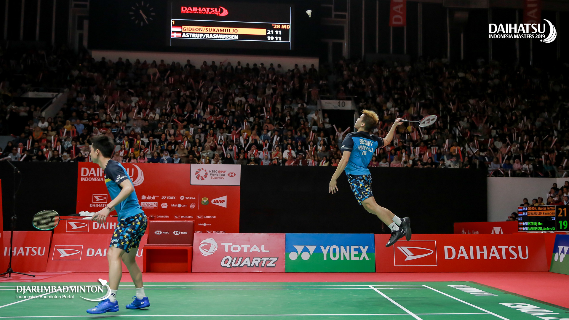 Marcus Fernaldi GIDEON/Kevin Sanjaya SUKAMULJO (Indonesia) bersiap melepaskan serangan