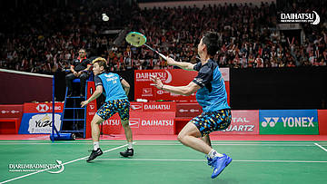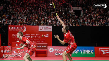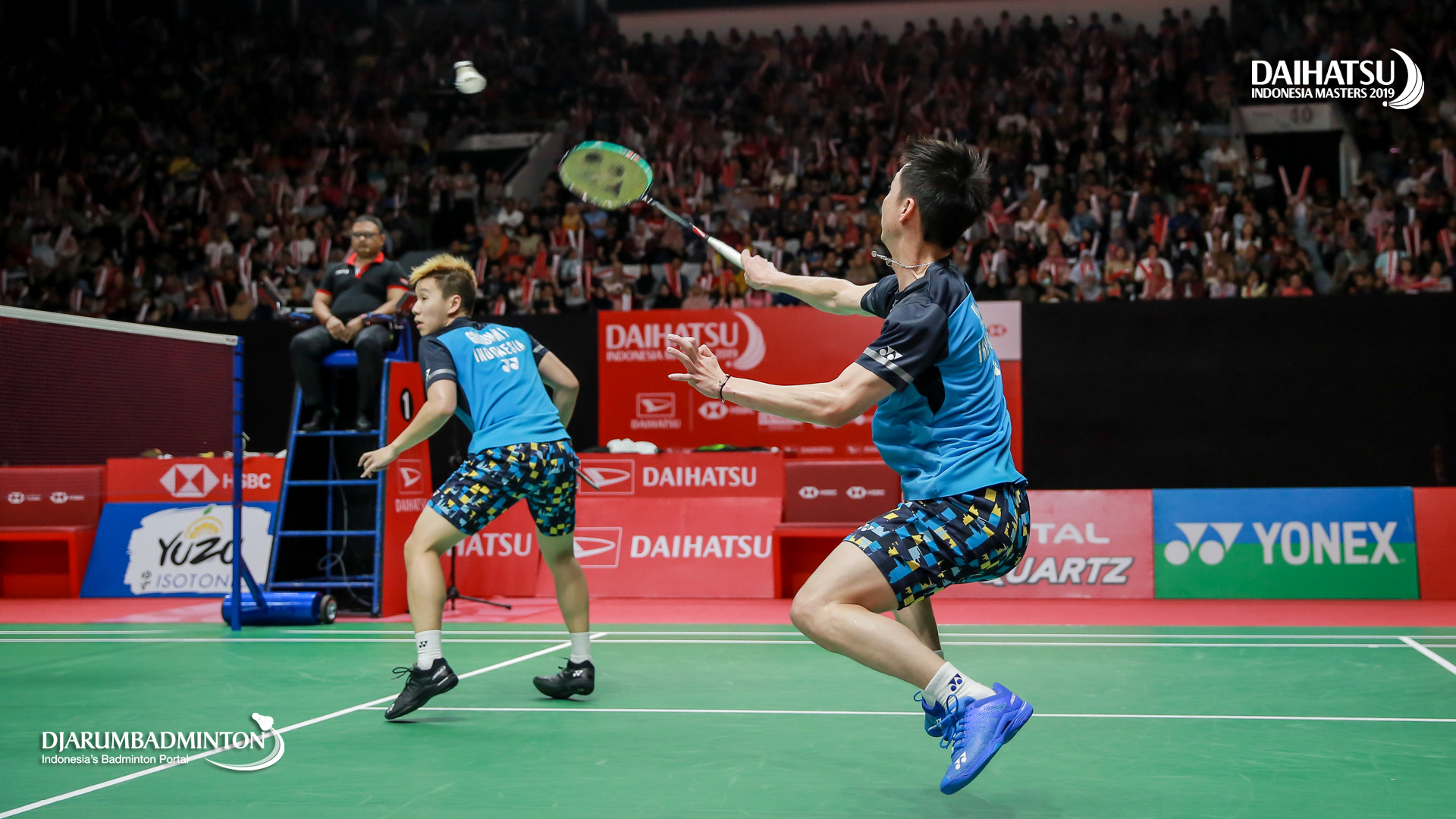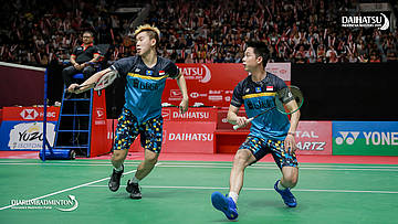 Marcus Fernaldi GIDEON/Kevin Sanjaya SUKAMULJO (Indonesia) mengembalikan serangan