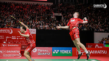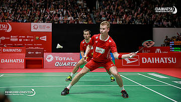 Kim ASTRUP/Anders Skaarup RASMUSSEN (Denmark) bersiap melepaskan serangan