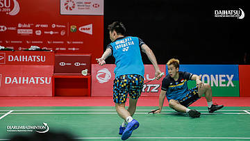 Marcus Fernaldi GIDEON/Kevin Sanjaya SUKAMULJO (Indonesia) berusaha melakukan pertahanan